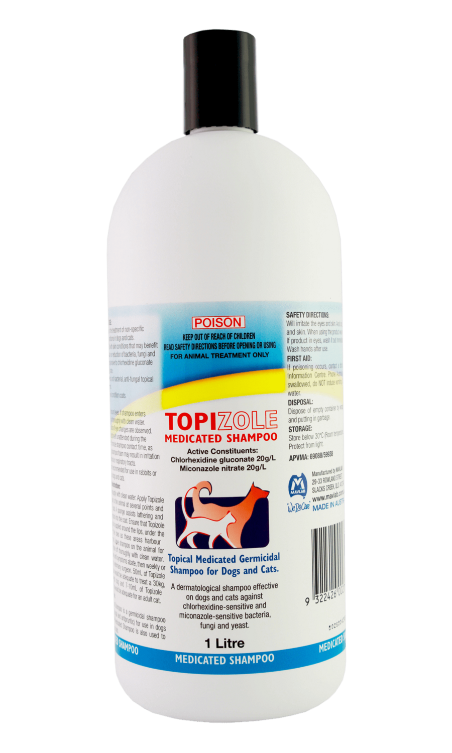 A medicated shampoo containing miconazole nitrate 20 g/L and chlorhexidine gluconate 20 g/L. For use on cats and dogs in the treatment of various skin infections including malassezia (yeast), fungi (ringworm) and a wide range of bacteria. It can also be used as a general shampoo to clean and condition coats. Available in 250mL, 500mL, 1L and 5L.